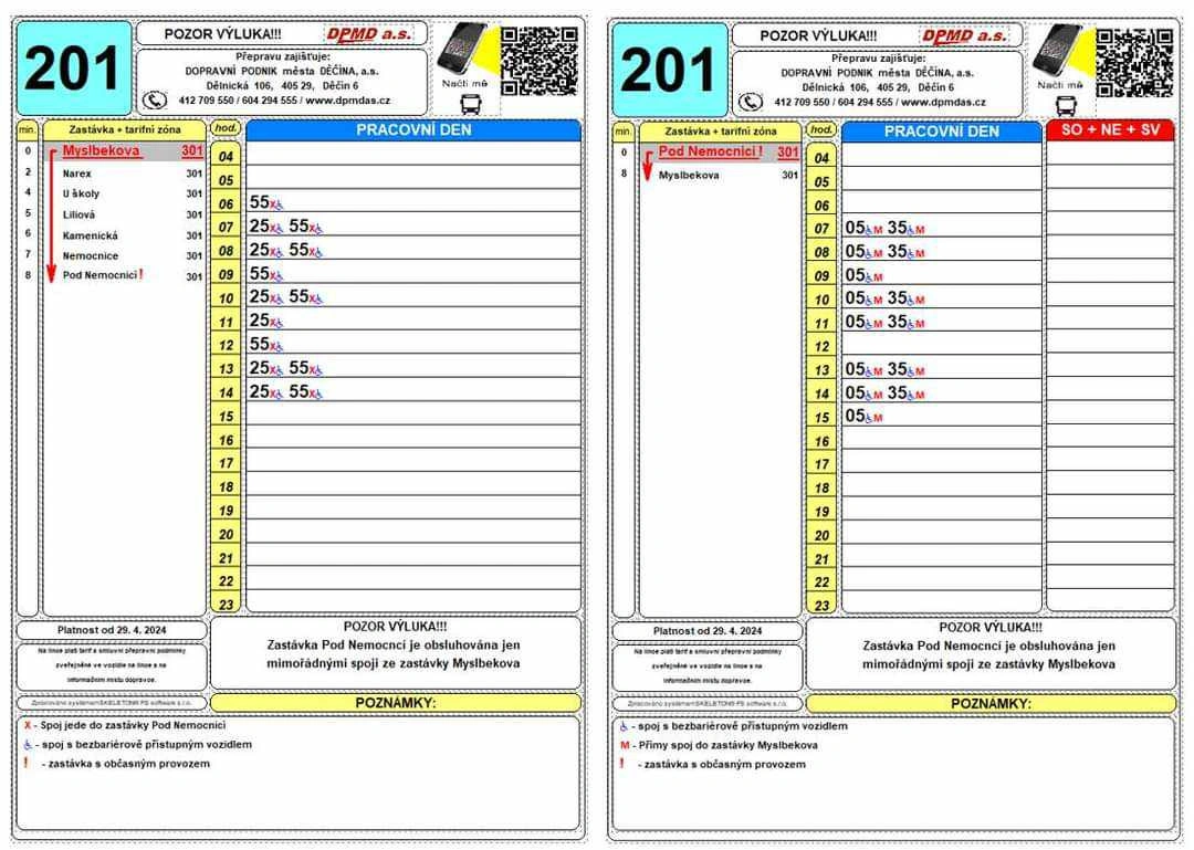 Děčín - Od pondělí 29. dubna dochází ke změně jízdních řádu na lince č. 201 v podobě zavedením mimořádných spojů ze zastávky Myslbekova do zastávky Pod Nemocnicí minibusem s kapacitou 15 sedících a 23 stojících cestujících.