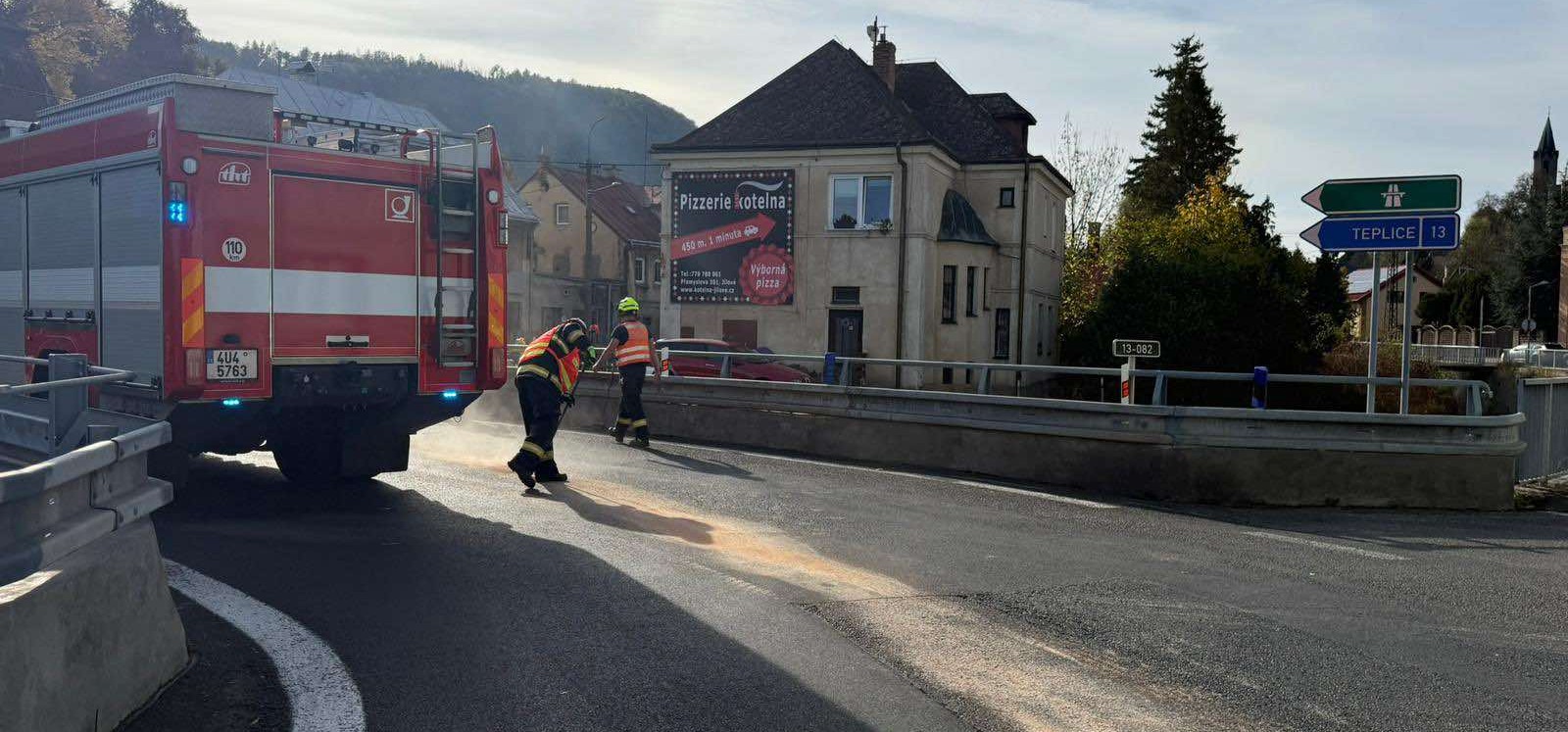 Jílové - Profesionální hasiči Děčín a dobrovolní hasiči Jílové vyjeli v neděli 19. října ve 14:24 k nahlášenému úniku oleje na mostě silnice 1/13 tzv. esíčku v Jílovém. Po příjezdu bylo zjištěno, že na olejové skvrně havaroval projíždějící motorkář. Událost se naštěstí obešla bez zranění.