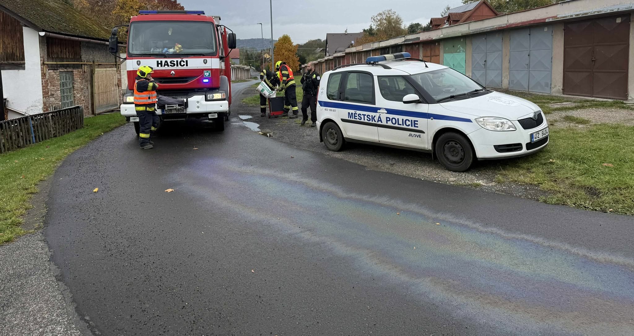 Jílové - Profesionální hasiči Děčín, dobrovolní hasiči a strážníci Jílové vyjeli ve čtvrtek 23. října v 11:58 k nahlášenému úniku provozních kapalin na silnici v Revoluční ulici v Jílovém - Kamenné.