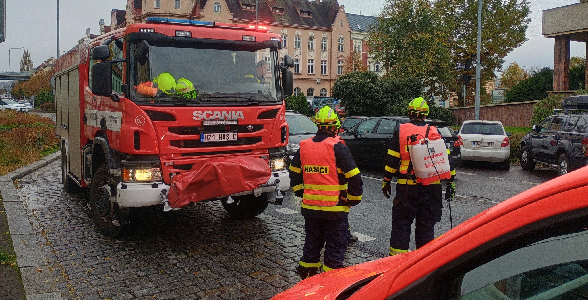 Děčín - Profesionální hasiči Děčín a dobrovolní hasiči Děčín - Horní Žleb vyjeli ve čtvrtek 23. října ve 14:45 k nahlášenému většímu úniku provozních kapalin v několika ulicích města. Jednalo se o hlavní silnici v Myslbekově ulici, Tyršově ulici a až k Mototechně.