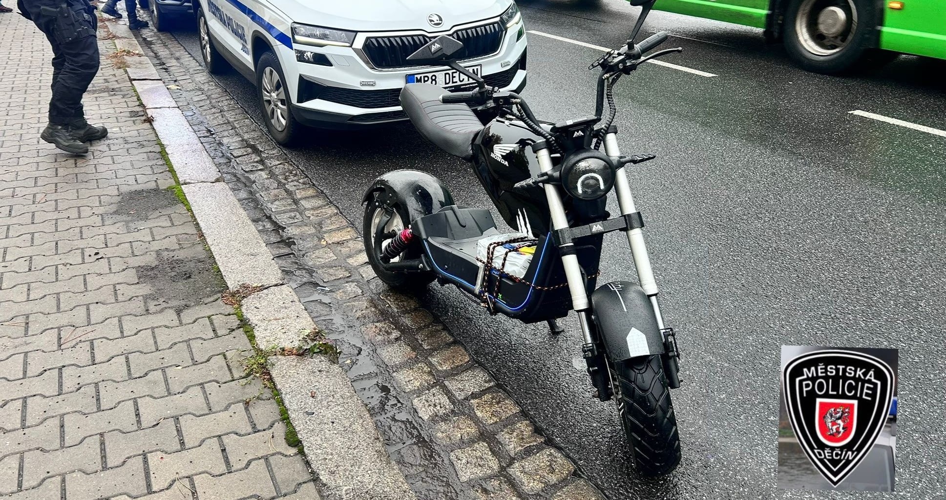 Děčín - Strážníci městské policie Děčín zastavili nedaleko kina Sněžník muže, který se jel na tzv. elektroskútru. Muž neměl ochranou přilbu, dopravní prostředek nebyl registrován, muž neměl potřebné řidičské oprávnění a navíc měl pozitivní test na drogy.