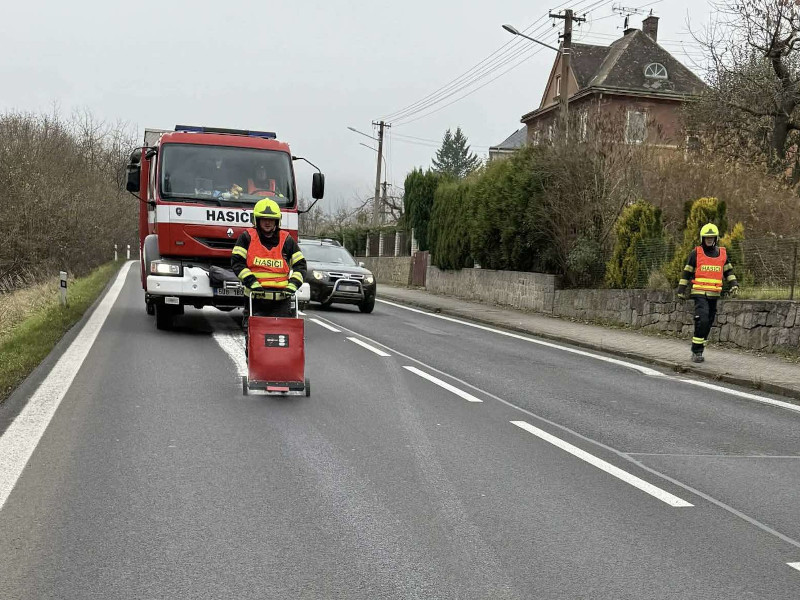 Jílové - Profesionální hasiči Děčín a dobrovolní hasiči Jílové vyjeli ve středu 12. listopadu v 10:21 k nahlášenému úniku většího množství oleje na silnici 1/13 v Jílovém.