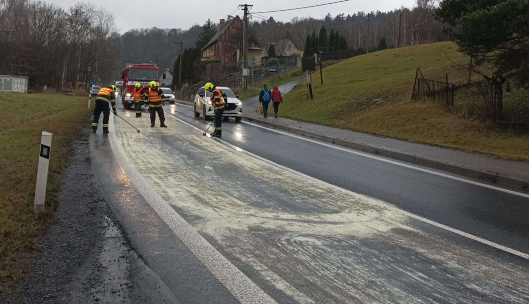 Jílové, Martiněves - Profesionální hasiči Děčín, dobrovolní hasiči a strážníci Jílové i policisté vyjeli v úterý 23. prosince po půl desáté dopoledne k většímu úniku provozních kapalin na silnici 1/13 z Jílového do Bynova.