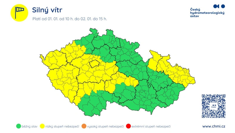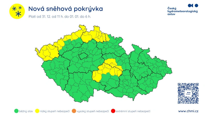 Od středečního dopoledne (31.12.) do čtvrtečního rána (1.1.) napadne na severozápadě a severu Čech a na severozápadním návětří Českomoravské vrchoviny až 8 cm, na horách až 15 cm nového sněhu. Z toho většina spadne za středeční odpoledne a večer. Od středečního večera se začnou zejména od vyšších poloh tvořit sněhové jazyky, na horách postupně i závěje. Jejich tvorba bude pokračovat minimálně do pátečního večera (2.1.). Od čtvrtečního dopoledne do pátečního odpoledne očekáváme zejména ve střední a západní části Čech, na severu Moravy a ve Slezsku čerstvý jihozápadní vítr s nárazy 15 až 20 m/s (55 až 70 km/h).