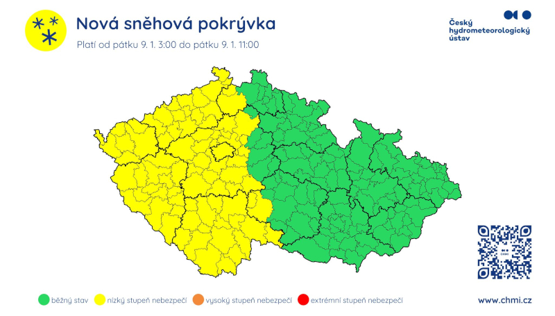 Ústecký kraj - Meteorologové vydali výstrahu před novou sněhovou pokrývkou. Ve druhé polovině noci na pátek 9. 1., v pátek ráno a dopoledne se očekává zejména v západní polovině a na jihu Čech výraznější sněžení.