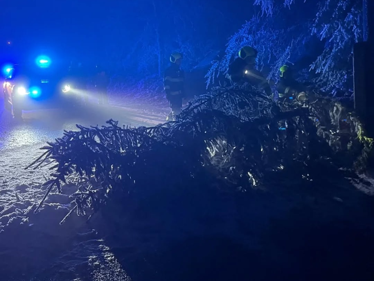 Krušné hory – Průběžně celou noc vyjížděli hasiči k ohlášeným popadaným stromům, nejvíce na Chomutovsku, kde také na silnicích do hor je nahlášeno několik uvízlých kamionů a několik úseků s námrazou, a to včetně hlavního tahu na hraniční přechod Hora Svatého Šebestiána.