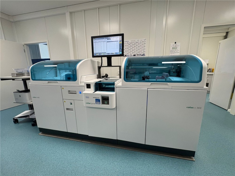 Personál se seznamuje s nově vysoutěženou zdravotnickou technikou od společnosti Roche, přístrojem Cobas Pure. „Dříve jsme museli dávat jednu zkumavku do dvou přístrojů, vyčkat na analýzu z prvního přístroje a následně dávat do druhého přístroje. Nový analyzátor je přesnější a rychleji vzorky vyhodnocuje. Vyhodnocení totiž zvládá v jednom kroku. Nabere si z jedné zkumavky jak biochemickou, tak imunochemickou část, a výsledek získáme během 15 minut,“ vysvětluje vedoucí rumburského oddělení.