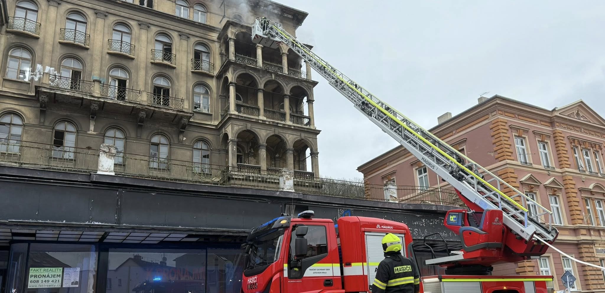 Děčín - Celkem čtyři hasičské jednotky (profesionální hasiči Děčín, dobrovolní hasiči Staré Město, Horní Žleb a Křešice) vyjely v neděli 15. března v 6:44 k nahlášenému požáru neobydleného domu na Teplické ulici v Děčíně. Po příjezdu bylo zjištěno, že hoří dvě patra domu.
