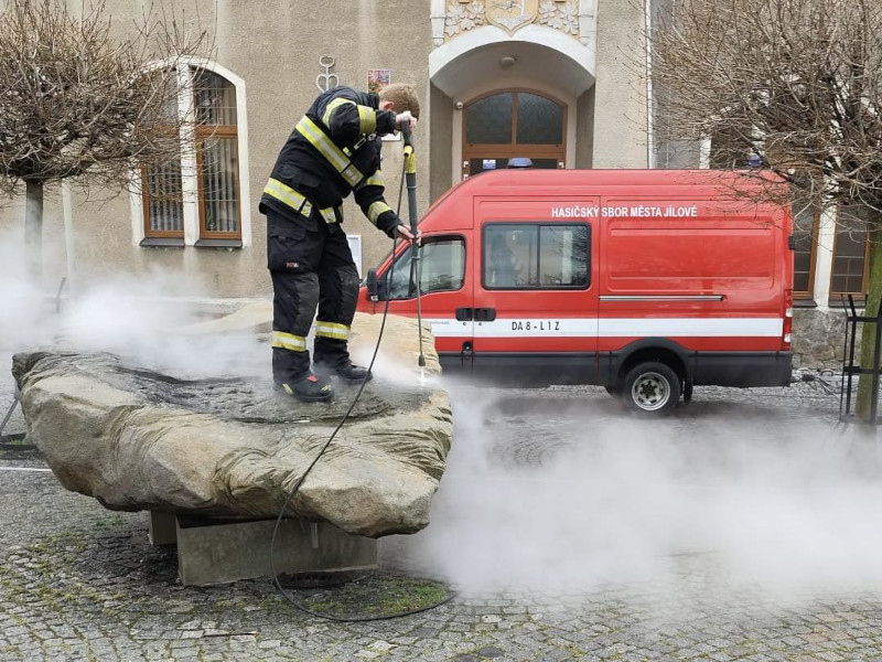 Jílové - Dobrovolní hasiči a pracovníci Místního hospodářství v Jílovém během tohoto týdne provádějí úklid Mírového náměstí a to hlavně jeho prvků, jako jsou květináče, kašna a další. Hasiči pomáhají hlavně s tlakovým mytím.