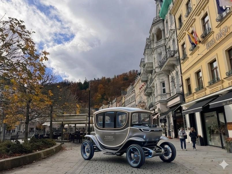 A Karlovy Vary? Tam jsme představili autonomní elektrické lázeňské kočárky, které by nahradily klasické koňské povozy v Karlových Varech. Inspirací byla kombinace moderních technologií a lázeňské tradice, doplněná o představu plně samořízených vozítek v historickém centru.