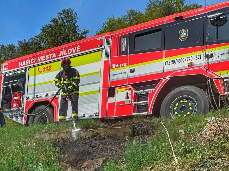 Jílové, Martiněves - Profesionální hasiči Děčín a dobrovolní hasiči se strážníky Jílové vyjeli v úterý 28. dubna ve 12:30 k nahlášenému požáru travního porostu u hlavní silnice na okraji města.