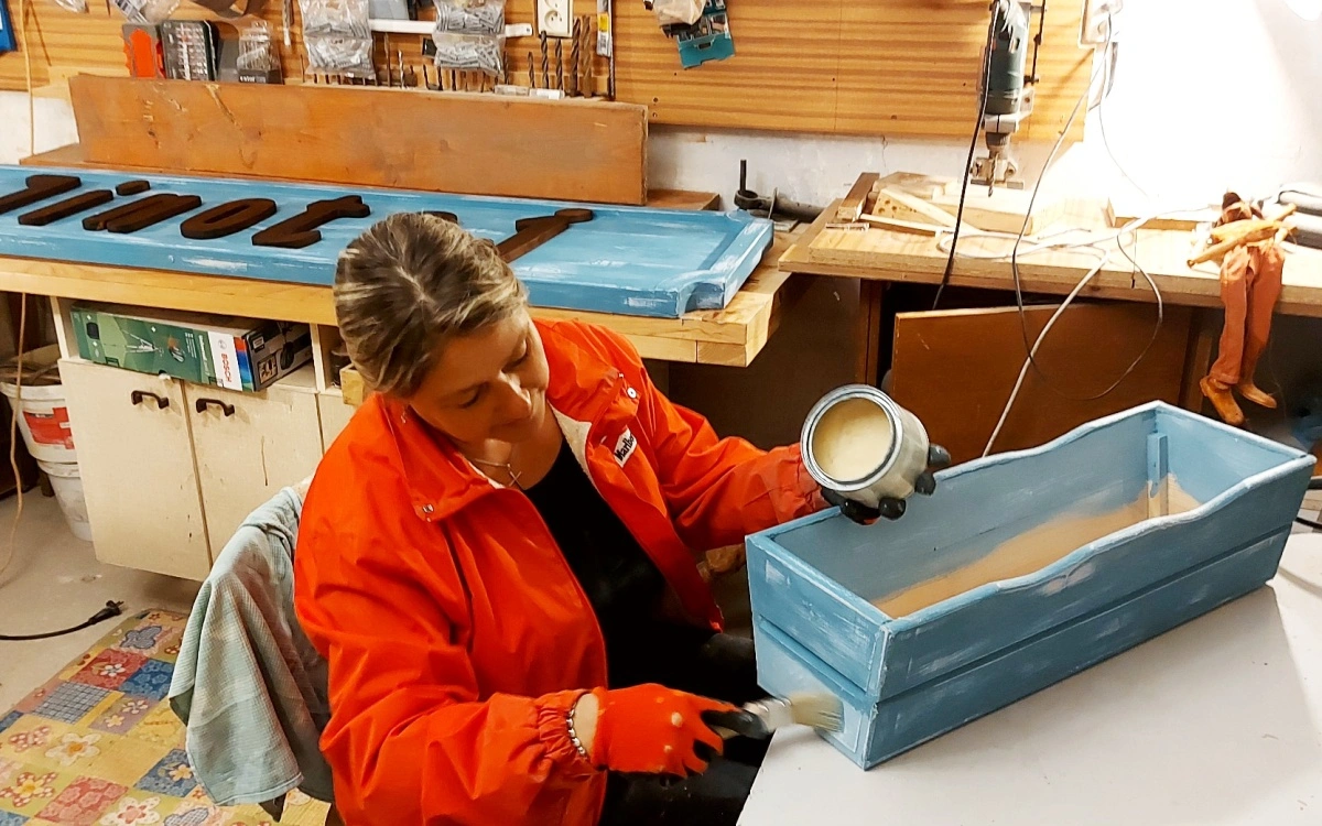Truhlíky dostaly barvu letního nebe. Stejně jako vývěsní listina a nápis nad dveřmi. Ještě pár dnů a stejně vesele bude zářit i plot kolem zahrady. Foto: archiv manželů Strýhalových